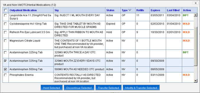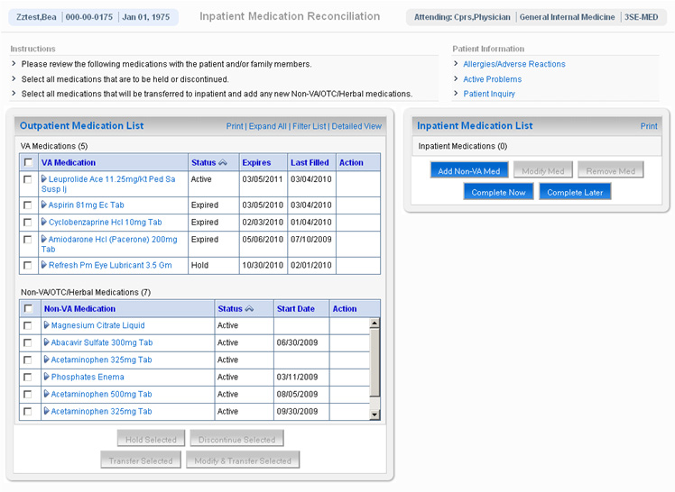 Despite the VA's advanced clinical computing systems including an electronic medication record, CPRS does not provide user-friendly mechanisms that will document medication reconciliation while at the same time safely order pre-admission medications from an outpatient list.