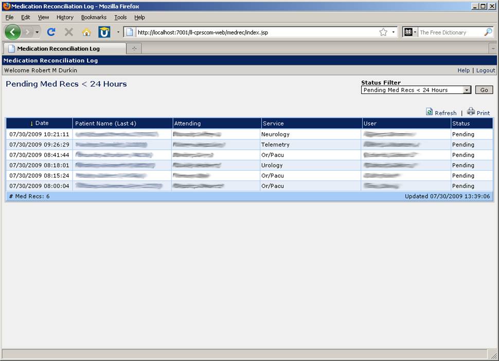 A Web-based reporting tool exists that allows a user to view a log of medication reconciliation activity. The most useful aspect of this log is in viewing lists of pending medication reconciliation records. For example, a patient safety officer may wish to view a list of inpatients for whom medication reconciliation has not yet been completed. The log displays the date and time at which the dialog was first displayed in CPRS, the patient's name and last 4, the attending for the patient, the service, and the user to whom the dialog was last displayed. The Web log is secured by VistA access/verify code login.