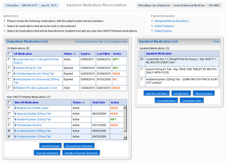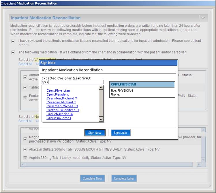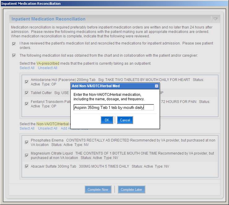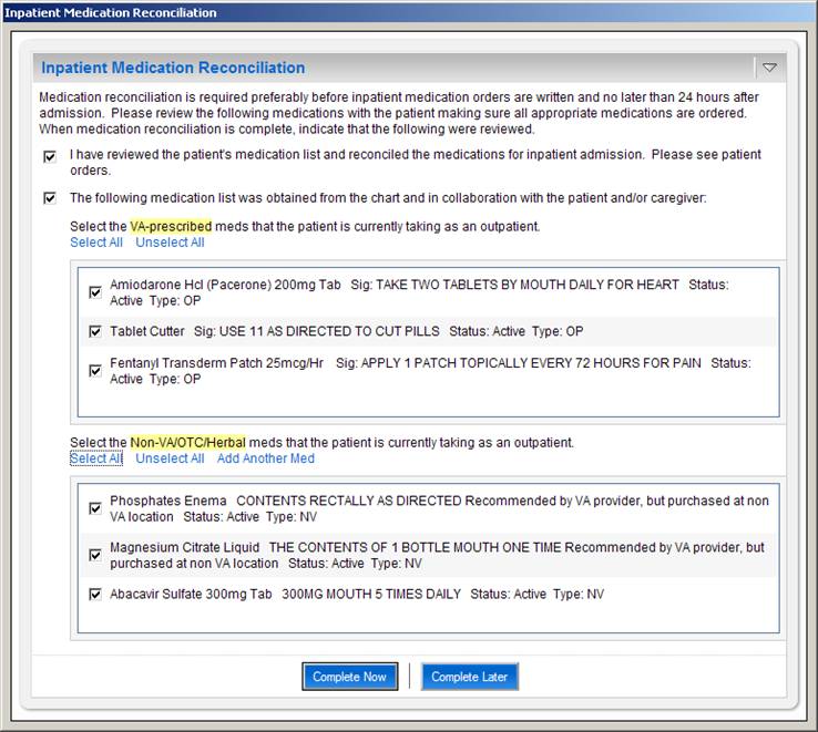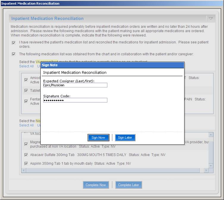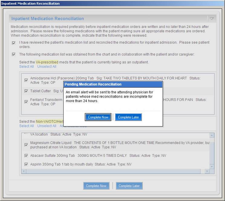 When one of the above actions is taken on selected medications, the Action field is updated to reflect the action. Medications that are to be continued on an inpatient basis are displayed in the table on the right side of the screen captioned "Inpatient Medication List". Medications in the Inpatient list may be modified or removed by clicking the appropriate buttons. Additional non-VA medications may also be added to the Inpatient list.The user can choose to complete medication reconciliation now or later. If the latter, the user's work is saved and the next time the dialog is displayed it reflects the work earlier performed. When the user clicks Complete Now the tool will check to ensure that action has been taken on every medication and then the medications will be ordered and a TIU note automatically generated reflecting the actions taken for each medication. Finally, the user can elect to electronically sign the orders and note within the tool itself.